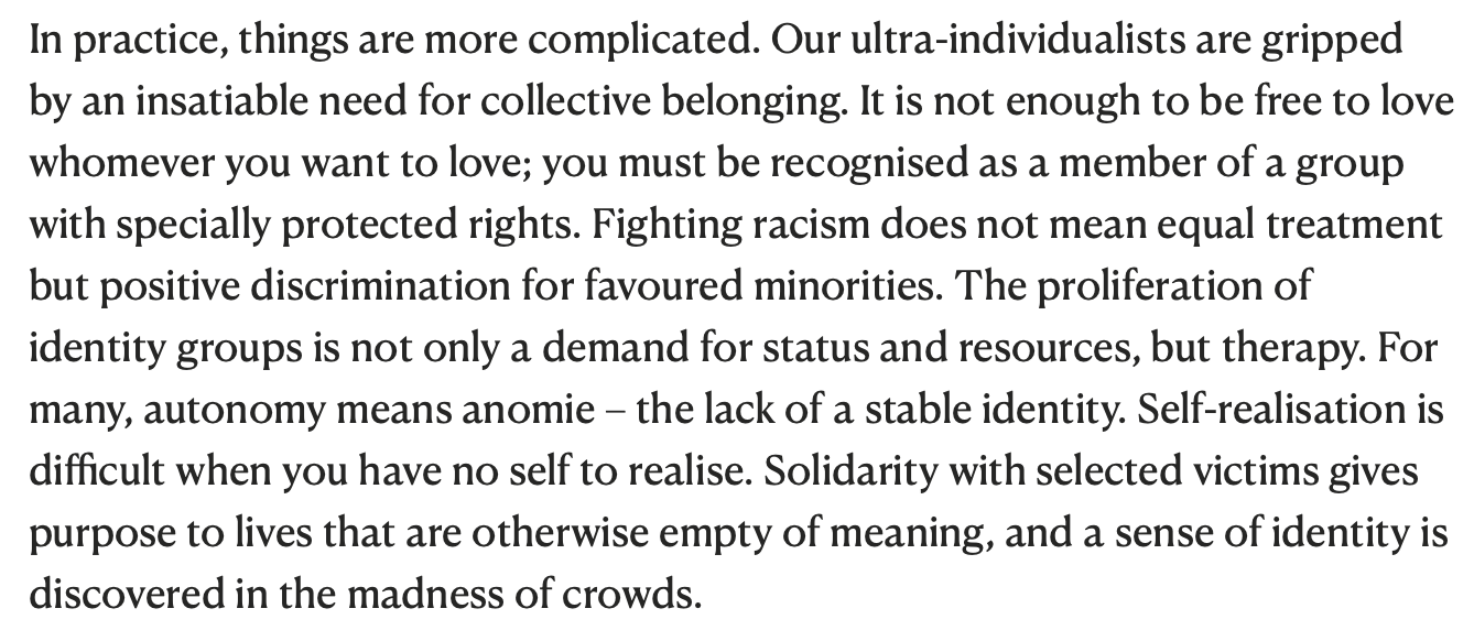 Az állítása szerint az ultaindividualista zeitgeistban élő személyek iszonyatosan vágynak a kollektív hovatartozásra és ezért olyan közösségeket kezdenek formálni, melyeknél a hovatartozáshoz bizonyos megkülönböztetett jogokat kezdenek rendelni, legyen az a melegközösség (egyes elemeiben), valamilyen pozitív diszkriminációt elérő etnikai közösség, és így tovább. Azt mondja, ez az egész már nem is az erőforrásokról szól, hanem egyfajta közéleti terápia, ahol az identitáson keresztüli, egyéniségtől megfosztott, önmegvalósítás elégíti ki a pszichés szükségleteket a kiüresedett életünkben. Gray konklúziója, mellyel én magam is hajlamos vagyok egyetérteni: ezek a magukat lehatároló közösségek, melyek megkülönböztetett bánásmódot vagy akár jogokat követelnek, vagy szimplán plusz kulturális elismerést, egy újfajta, gyakran szubtilis de, kibékithetetlen, tehát permanens belső harcba taszítanak társadalmakat.
