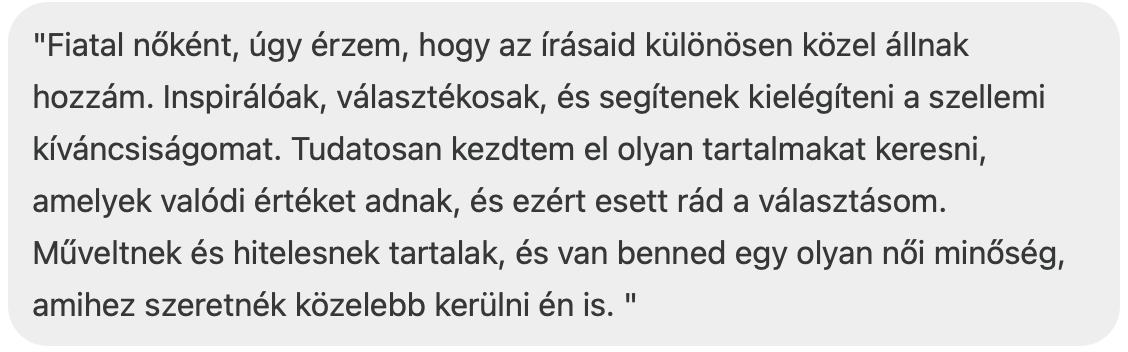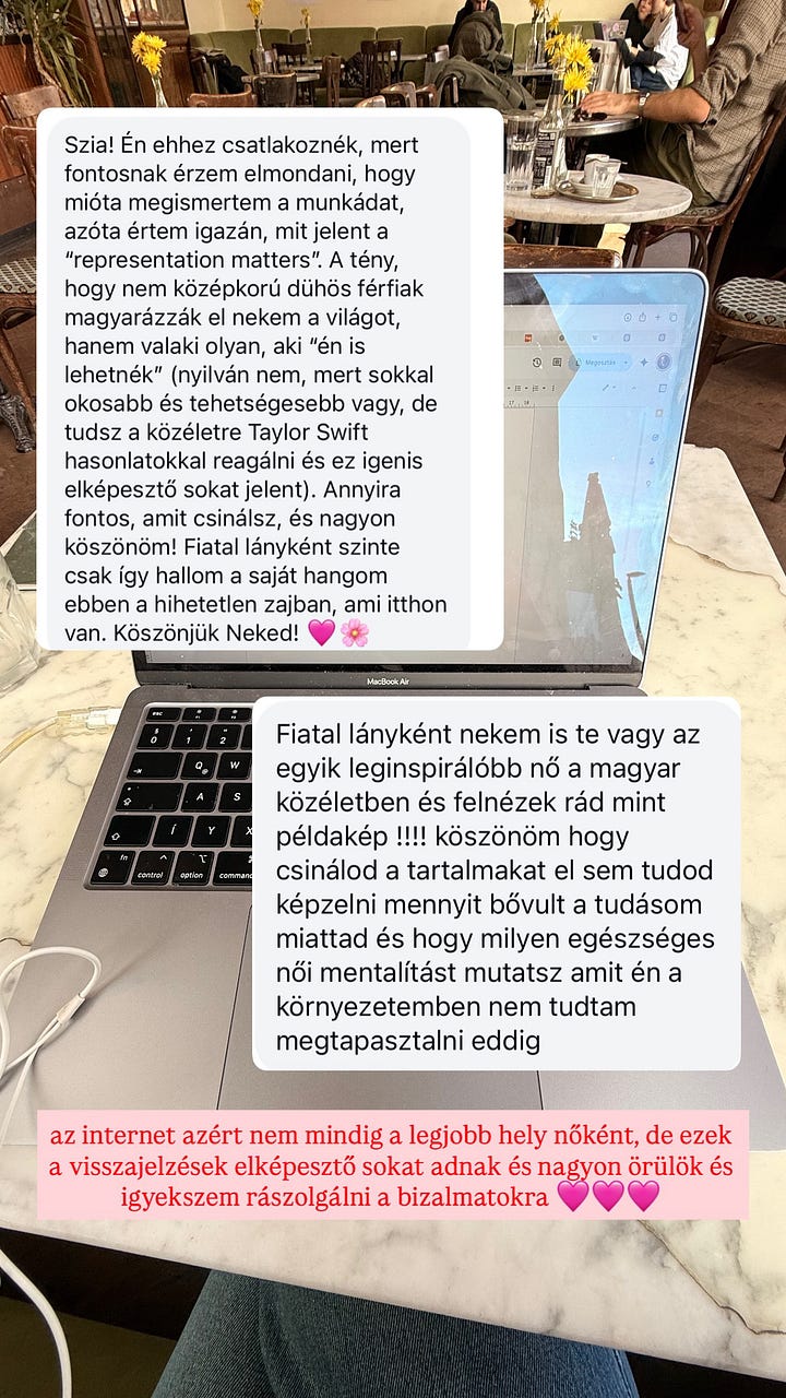 Mindenesetre, ennek a folyamatnak a részeként egyszerűen elkezdett szembejönni velem az a valóság, hogy igenis sok nőnek jelent valamit az, hogy egy közéleti reggeli műsorban rendszeresen van női műsorvezető, vagy az, amit itt a Substack-en a hírlevélben csinálok.